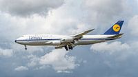 Deze Queen of the skies van Lufthansa in retro livery vlak voor de landing gefotografeerd bij de luchthaven van Frankfurt am Main.