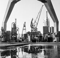 De haven bracht een mooi industrieel doorkijkje tussen de havenkranen met reflecties in de plassen op de grond en met wat geduld vanwege wandelaars werd deze plaat geschoten.