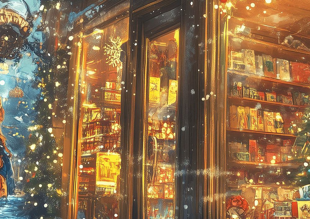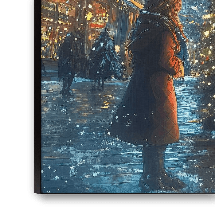 Een betoverend schilderij met een nostalgische kerstsfeer in een gezellige winkelstraat. De etalages van de winkels zijn prachtig versierd met glinsterende lichtjes.