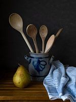 Koop dit stilleven Nostalgisch stilleven met Keulse Pot, lepels en peer van Kok and Kok op canvas, aluminium dibond, (ingelijste) fotoprint, behang en ArtFrame, op maat geprint in Fine-Art kwaliteit.