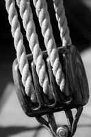 Een oud zeiljacht gemaakt van kostbaar hout, met nog functioneel houten gebruiksvoorwerpen op het schip. Close-up van een katrol.