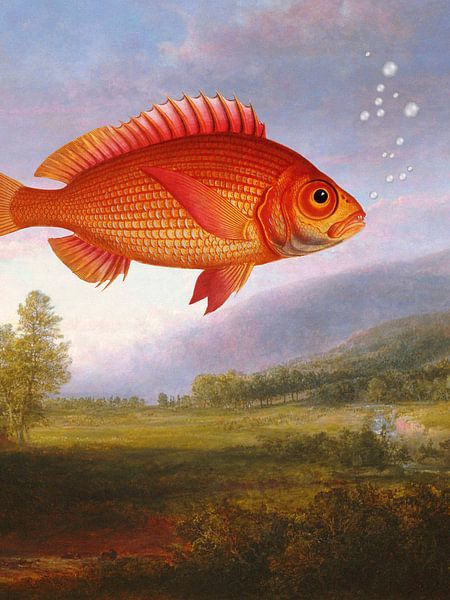 Een onwaarschijnlijke situatie, deze oranje vis boven een bosrijk landschap...
