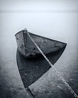 Een verstild beeld van een roeiboot op een mistige wintermorgen die de strijd met de elementen verloren lijkt te hebben maar zich nog niet gewonnen geeft en zijn hoofd boven water houdt, wachtend op het mooie weer van het voorjaar en de zomer.