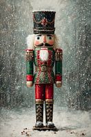 Een statige notenkraker in traditionele militaire klederdracht, uitgevoerd in feestelijke kerstkleuren groen en rood, staat trots tegen een dromerige, grijze winterachtergrond met zachte sneeuwval. Het klassieke ontwerp met zijn kenmerkende zwarte hoge hoed, sierlijke goudaccenten en weelderige witte baard straalt een tijdloze kerstsfeer uit die nostalgische herinneringen oproept.