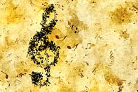 Een abstract werk met muzieknoten en in het bijzonder de sol-sleutel of g-sleutel of vioolsleutel in de hoofdrol. Dit is de derde en laatste variant waarin een muzieknoot die bestaat uit kleine muzieknoten omringt door zwevende muzieknoten op een textuur van papier afgebeeld wordt.