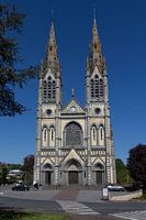 De mooie gevel van de Onze-Lieve-Vrouwekerk (Notre Dame) in Vimoutiers, in Orne, Normandië, Frankrijk, op een zonnige lentedag.