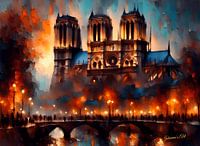 Ontdek de magie van de Notre Dame met dit fascinerende kunstwerk bij zonsondergang. Johanna's meesterlijke werk vangt het iconische Parijse monument. Een must-have voor kunst- en reisliefhebbers.