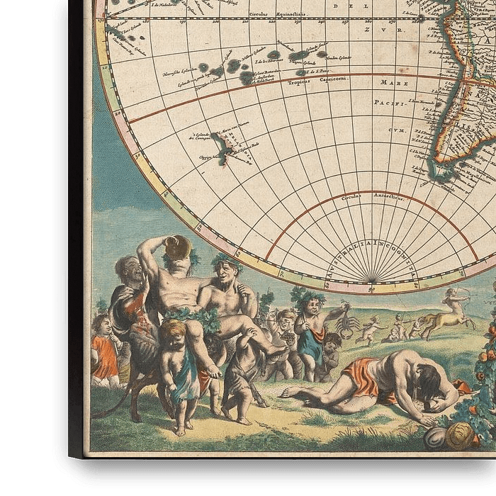 Nova orbis tabula in lucem edita (1675), Frederik de Wit Dubbel halfrond wereldkaart uitgegeven door Frederik de Wit (1629-1706), met twee poolprojecties en taferelen van de vier seizoenen en tekens van de dierenriem in de hoeken, gegraveerd en met de hand ingekleurd in Amsterdam.