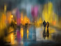 Het roept vooral een warme, hartverwarmende romantiek op, vermengd met nostalgie en geborgenheid. Je voelt de liefde en verbondenheid tussen het stel, een gevoel van "wij tegen de wereld", terwijl de regen en abstracte lichten een dromerige, bijna magische intimiteit toevoegen – perfect voor momenten van tederheid en herinneringen aan…
