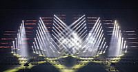 Lichtshow Noviter in het Philips Stadion tijdens Glow 2019. Deze kleurrijke show met lichtstralen en lasers kan een blijvende herinnering aan de muur worden.