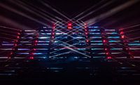 Lichtshow Noviter in het Philips Stadion tijdens Glow 2019. Deze kleurrijke show met lichtstralen en lasers kan een blijvende herinnering aan de muur worden.