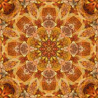 Het is eigenlijk niet meer te herkennen maar ten grondslag aan dit abstracte beeld ligt een foto van de gevallen bladeren van een plataan in de herfst. Ik heb die foto gekopieerd, geroteerd en gespiegeld. De kopieën heb ik vervolgens transparant over elkaar gelegd. Daardoor is dit geometrische kunstwerk ontstaat waarin het geelbruin van…