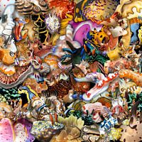 Collage van ongeveer 90 verschillende naaktslakken. Naakt slakken zijn slakken die onder water leven. Er zijn honderden verschillende met diverse vormen en een variatie van het hele prisma van kleuren.