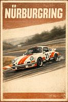 Een tijdloos eerbetoon aan de klassieke Duitse motorsport op de legendarische Nürburgring. Deze poster in vintage-stijl toont een historische raceauto die met hoge snelheid door een bocht gaat, met retrotexturen en opvallende racestrepen die pure prestaties en racegeschiedenis vieren.