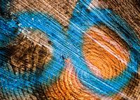 Deze boomstam lag op een stapel stammen in het bos. Het nummer erop gespoten, waarschijnlijk zodat de eigenaar weet welke stapel hout van hem is. Het blauw van de verf contrasteert mooi met het oranje in het hout en geeft een haast abstract beeld.