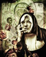 Surreële collages gemaakt van gelaagde beelden van divers eigen werk. Verweerde details, krassen en digitale natte plaat technieken. Oude iconen en model Britt als non.