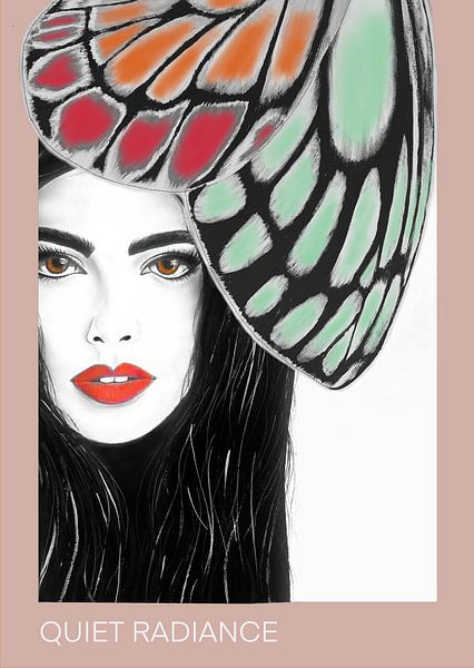 Wat jij in dit portret ziet, is het belangrijkst. Misschien wordt je blik direct gevangen door de vlinder die als een beschermende vorm over het hoofd ligt — een symbool van kwetsbaarheid én kracht. Misschien zijn het de warme ogen die je aankijken, of het contrast tussen het zachte gezicht en de uitgesproken grafische vleugels. Of…