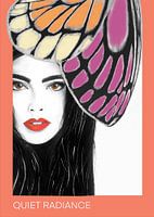 Wat jij in dit portret ziet, is het belangrijkst. Misschien wordt je blik direct gevangen door de vlinder die als een beschermende vorm over het hoofd ligt — een symbool van kwetsbaarheid én kracht. Misschien zijn het de warme ogen die je aankijken, of het contrast tussen het zachte gezicht en de uitgesproken grafische vleugels. Of…