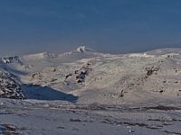 Zicht op het vergletsjerde vulkanische massief Öræfajökull, onderdeel van Vatnajökull, in het zuiden van IJsland in de winter met de top van Hvannadalshnúkur (2.110m), de hoogste berg van IJsland op een zonnige avond.
