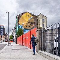 Deze Mural bevind zich in de stad Cork in Ierland. Je ziet een mensfiguur met een doos in de vorm van een huis op zijn hoofd. Er is een gat waar 1 oog door heen kijkt en het andere oog lijkt doorboord met een stalen stang. Een man loopt langs en je zou je kunnen voorstellen dat ze het allebei denken: OMG!