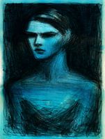 Een ingetogen portret waarin houtskool en blauw elkaar ontmoeten. De figuur lijkt te zweven tussen licht en schaduw, tussen verschijnen en verdwijnen. De expressie is stil, maar geladen — een innerlijke staat gevangen in lijn en kleur.
