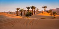 Oase bij Merzouga, Marokko. De zandduinen van Erg Chebbi zijn met de auto makkelijk bereikbaar. Het is daarom een van de bijzondere trekpleisters van Marokko. Hier zijn de palmbomen gefotografeerd bij mooi ochtend zonlicht.