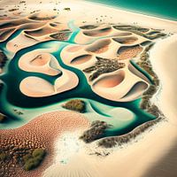 Oasis Pattern toont een luchtfoto van een buitenaards woestijnlandschap, waar zachte, gouden zandduinen rond levendige turquoise waterkanalen stromen. Het opvallende contrast tussen de vloeiende vormen en felle kleuren straalt zowel sereniteit als surrealisme uit. De schaarse vegetatie voegt organische textuur en diepte toe aan het…