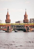 Terwijl de Berlijnse metro zich een weg baant over de Oberbaumbrücke, baant de boot zich een weg in de Spree.