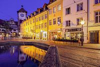 De historische oude stad met de Schwabentor, een van de twee beroemde stadspoorten van Freiburg, bij nacht.
