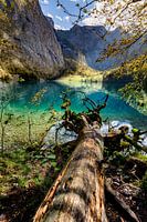 Boomstam aan de oever van het Obersee meer in Berchtesgadener Land, Beieren, Duitsland.