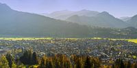 Im Vordergrund des Panoramafotos liegt das malerische Oberstdorf, ein charmantes bayerisches Dorf, das von herbstlichen Wäldern und Wiesen umgeben ist. Die klare Luft verströmt einen Hauch von Frische, und der Duft von Laub und Erde liegt in der Luft. Die Dächer der Häuser glänzen in der Abendsonne, und die Dorfkirche reckt stolz ihren Turm gen Himmel.