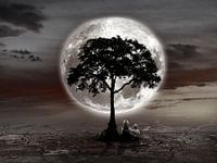 Surrealistische creatie van een klein meisje dat haar broertje uitnodigt om te dromen terwijl ze naar de maan kijkt onder een schaduwrijke boom