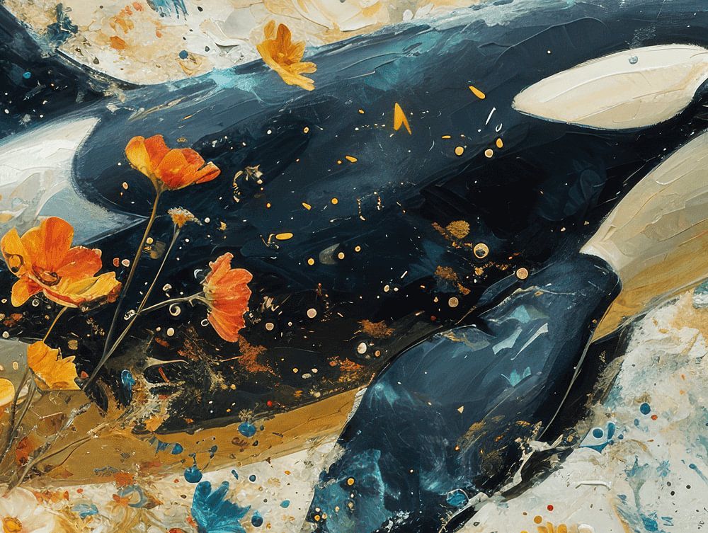 "Oceaan Bloesem" is een unieke fusie van zeeleven en bloemrijk landschap, waarin een orka zacht zweeft tussen levendige wilde bloemen. De krachtige contrasten tussen het diepe zwart-wit van de orka en de heldere, kleurrijke bloemen creëren een onverwachte esthetische dialoog. De dikke textuur van de verf en de losse, vrije penseelstreken suggereren een droomachtige wereld waarin de grenzen tussen het aquatische en het aardse vervagen. Dit kunstwerk nodigt uit tot reflectie over de harmonie in de natuur en zou een betoverend element toevoegen aan elke ruimte, ideaal voor liefhebbers van zeeleven en natuurlijke schoonheid.