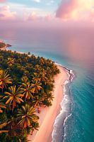 Een adembenemend luchtperspectief van een gebogen tropisch strand, met zachte pastelroze en blauwe tinten over de oceaan en de jungle