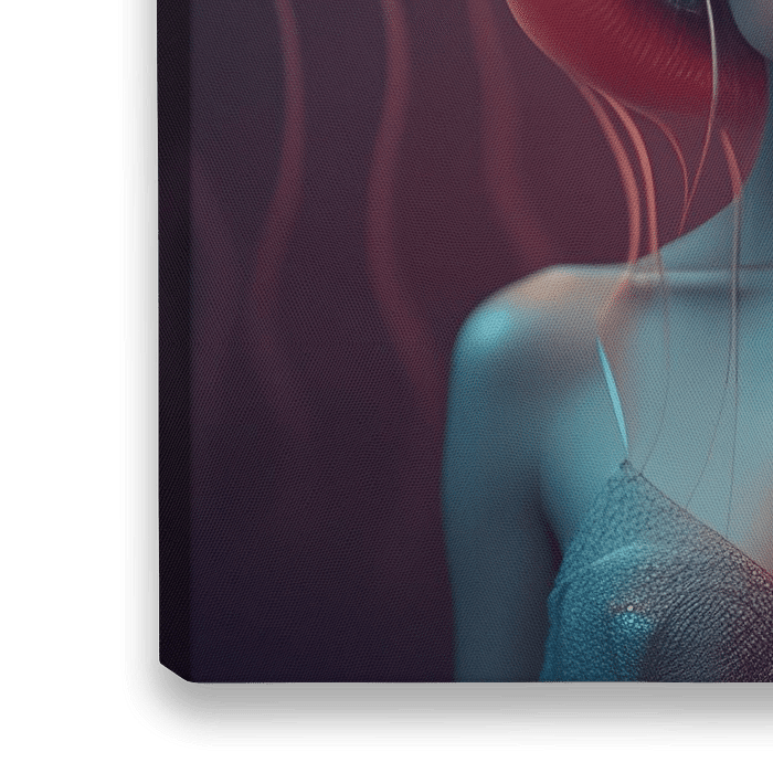 Dit betoverende kunstwerk, getiteld "Oceaansymfonie," biedt een schouwspel van kleur en beweging waarin de vrouw en de oceaan samenkomen in een majestueuze dans. In het middelpunt staat de vrouw, haar hoofd gehuld in een fel rood oranje kwal die lijkt te dienen als een elegante hoed, een eerbetoon aan de pracht van de onderwaterwereld.