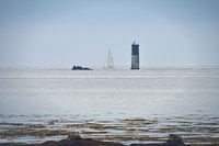 Aan de ene zijde is een rotspartij in zee te zien en aan de andere zijde een kleine vuurtorenboei.