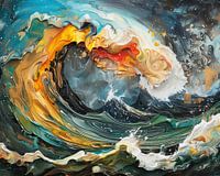 Ocean's Blaze - Dit abstracte schilderij werpt een hypnotiserende blik op een wereld van kleur en beweging. Centraal in het kunstwerk is een grote, dynamische golf, die lijkt te buigen en te kronkelen met een levenseigen intensiteit. De kleuren van de golf variëren van diep zeegroen tot een donker, haast nachtelijk blauw, met accenten van schuimend wit dat de toppen siert en de kracht van het water suggereert. Binnen deze woeste waterbewegingen zijn vurige oranje en goudgele tinten verwerkt die het beeld een viscerale warmte geven. Deze vlammende kleuren lijken vanuit de kern van de golf op te lichten, alsof er een verborgen vuur onder het wateroppervlak brandt. Het geheel is bezaaid met sprankelende en spetterende details in wit en goud, waardoor het lijkt alsof sterrenstof over de golf is uitgestrooid. Dit meesterlijk abstracte schilderij speelt met texturen, van gladde olieverf passepartouts tot ruwe, bijna korrelige segmenten waar de verf dik is aangebracht.