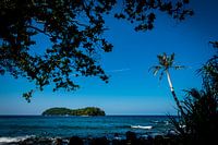Een mooi uitzicht van een tropisch tafereel. De groene vegetatie op de voorgrond geven een sierlijke omlijsting aan dit beeld. Je wordt als het ware naar binnen gezogen. Direct gaat je oog naar het kleine iddylische tropische eilandje aan de horizon. Je zou bijna de oceaan willen overzwemmen om naar het eiland toe te gaan. Het blauwe water, de blauwe lucht geven een zomerse sfeer aan deze foto. De palmboom steekt mooi uit en vangt hee mooi het felle zonlincht. Dit is gefotografeerd in Sumatra op het eiland Pulau Weh in Azie.