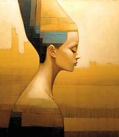 Fantasie portret van een vrouw in een collage van verweerde hout panelen in voornamelijk okergeel.