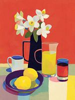 Een modern stilleven met narcissen, heldere citroenen en doorschijnend glaswerk tegen een warme rode achtergrond, waarin licht, evenwicht en alledaagse schoonheid worden gevierd door middel van gedurfde kleuren en vereenvoudigde vormen.