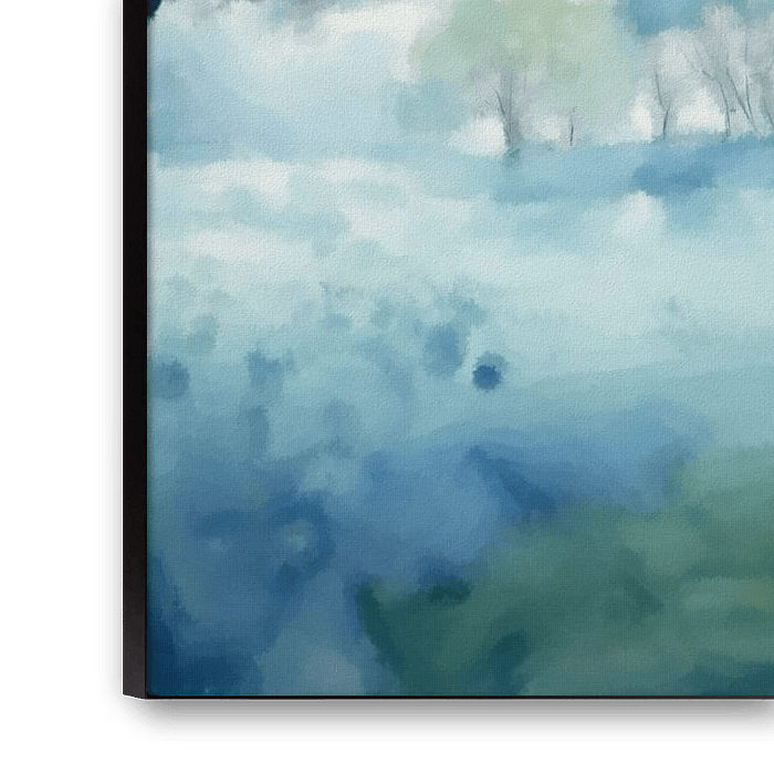 Een serene aquarel toont een rustig landschap waar een eenzame boot rust op een kalm waterlichaam, geflankeerd door elegante bomen met grillig gespiraliseerde takken. De kleuren versmelten zachtjes en creëren een dromerige sfeer die een gevoel van vrede en eenzaamheid oproept.
