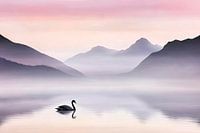 Het kalme wateroppervlak glinstert in zachte pastelkleuren, terwijl een majestueuze zwaan er elegant overheen glijdt. Zachte heuvels en mistige bergen geven het beeld een dromerige diepte. Dit harmonieuze tafereel is perfect voor de slaapkamer, waar het rust en ontspanning uitstraalt en de ziel kalmeert.
