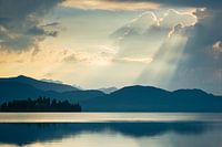 De zon schijnt door onweerswolken op een zomerse ochtend bij Walchensee.