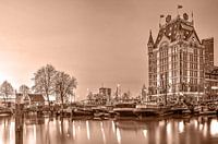 Een monochroombeeld in sepiatinten van het Witte huis en de Oude Haven in Rotterdam in de vroege ochtend. Op de voorgrond enkele historische binnenvaartschepen, op de achtergrond zijn de Erasmusbrug en gebouw De Rotterdam zichtbaar.