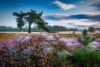 De ochtend dauw maken de spinnenwebben extra zichtbaar op de bloeiende heide.