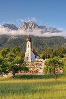 Uitzicht op de parochiekerk St. Johannes der Täufer in Obergrainau voor het machtige landschap van het Wettersteingebergte met de Großer Waxenstein in het midden van de foto.