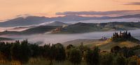 De Italiaanse provincie Toscane biedt prachtige landschappen en vergezichten. Favoriet daarbij is de mooie Val d'Orcia ten zuiden van Siena, waar de glooiende landschappen vol staan met de iconische dunne cipressen. Deze foto is gemaakt tijdens zonsopkomst op een mistige ochtend met uitzicht op het toepasselijk genoemde Belvedere.