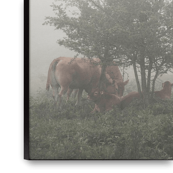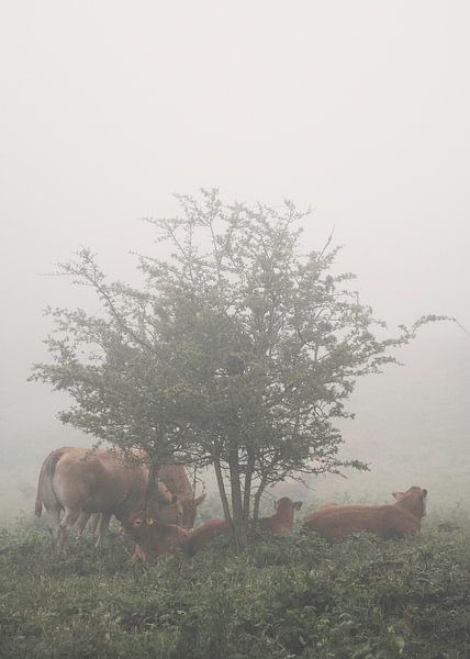De ochtendmist is nog niet verdreven door de zon, en het vee dat de zomer doorbrengt in de heuvels van Flade Bakker (de heuvels van Flade in het noorden van het eiland Mors, Denemarken) neemt de tijd om wakker te worden voor een nieuwe dag.