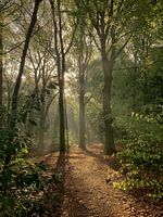 De nacht bracht regen. De ochtend brengt de zon. De zonnestralen schijnen fel door het vochtige bos. De vogels zingen vrolijk om hun territorium te beschermen en op zoek te gaan naar een partnervogeltje. Het nieuwe blad aan de bomen en struiken verraadt dat het voorjaar is. Een fantastische foto om in weg te dromen.