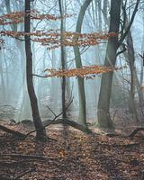 Mooie ochtend, mist en zonlicht verschijnen door de bomen. Speulderbos, Nederland.